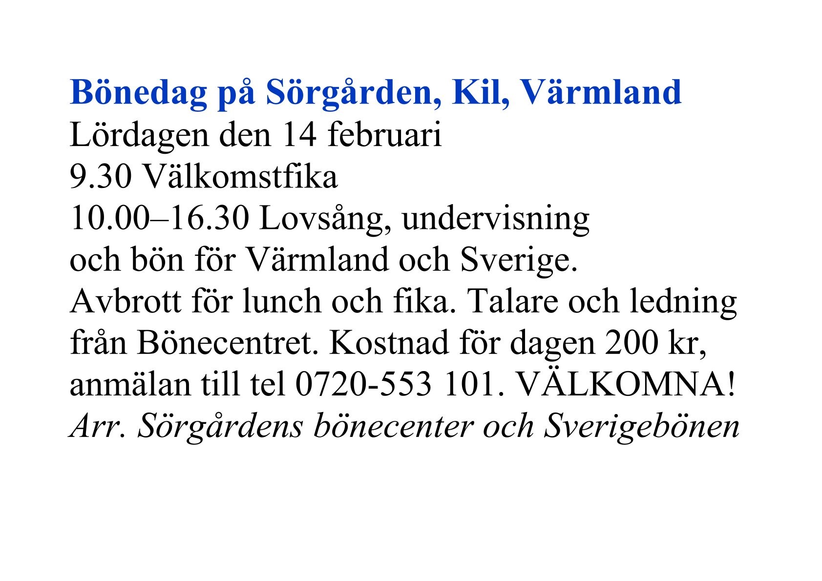 Bönedag på Sörgården, Kil, Värmland lördag 14 februari