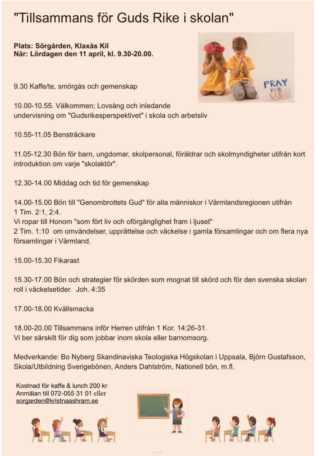 Tillsammans för Guds Rike i skolanBöndag för skolan och VärmlandPlats: Sörgården, Klaxås - KilKontaktperson: Anmälan till 072-055 31 01 eller sorgarden@kristnaashram.seKontaktperson: Anmälan till 072-055 31 01 eller sorgarden@kristnaashram.se